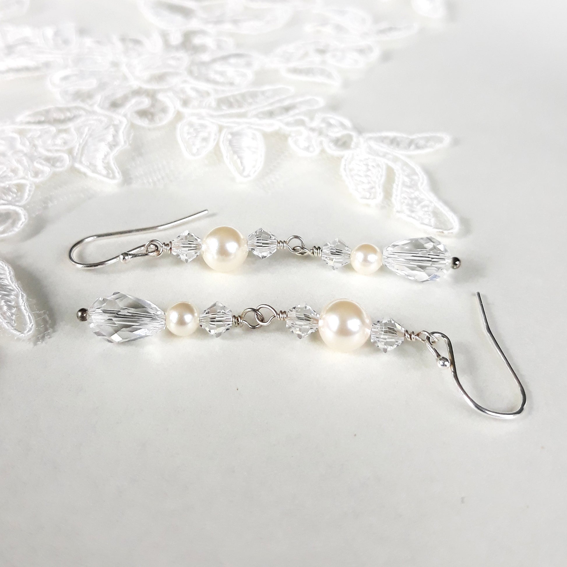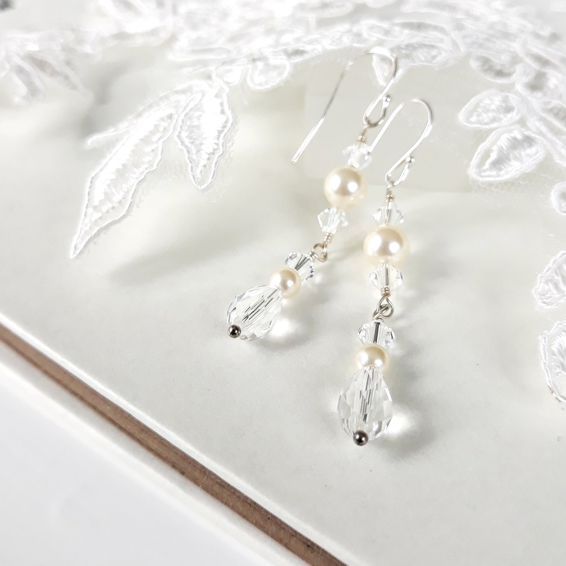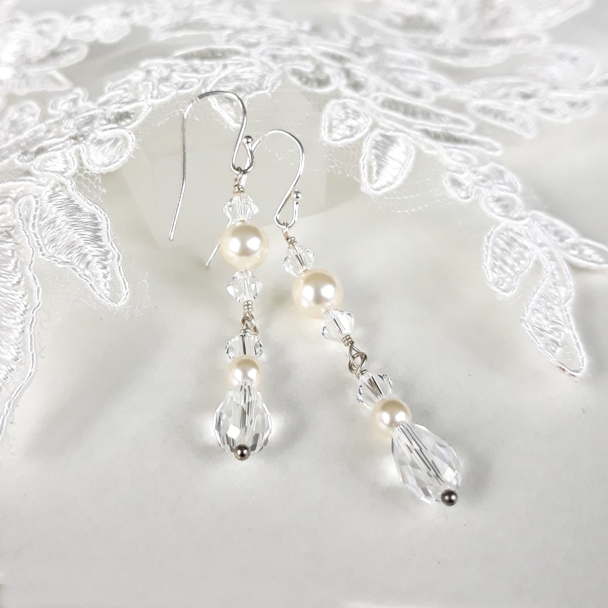 Elegant silver wedding earrings featuring premium glass pearls and glistening quality crystals. Handmade to order in your chosen pearl colour. Perfect for special occasions or weddings whether you're the Bride, Bridesmaid or Mother of the Bride